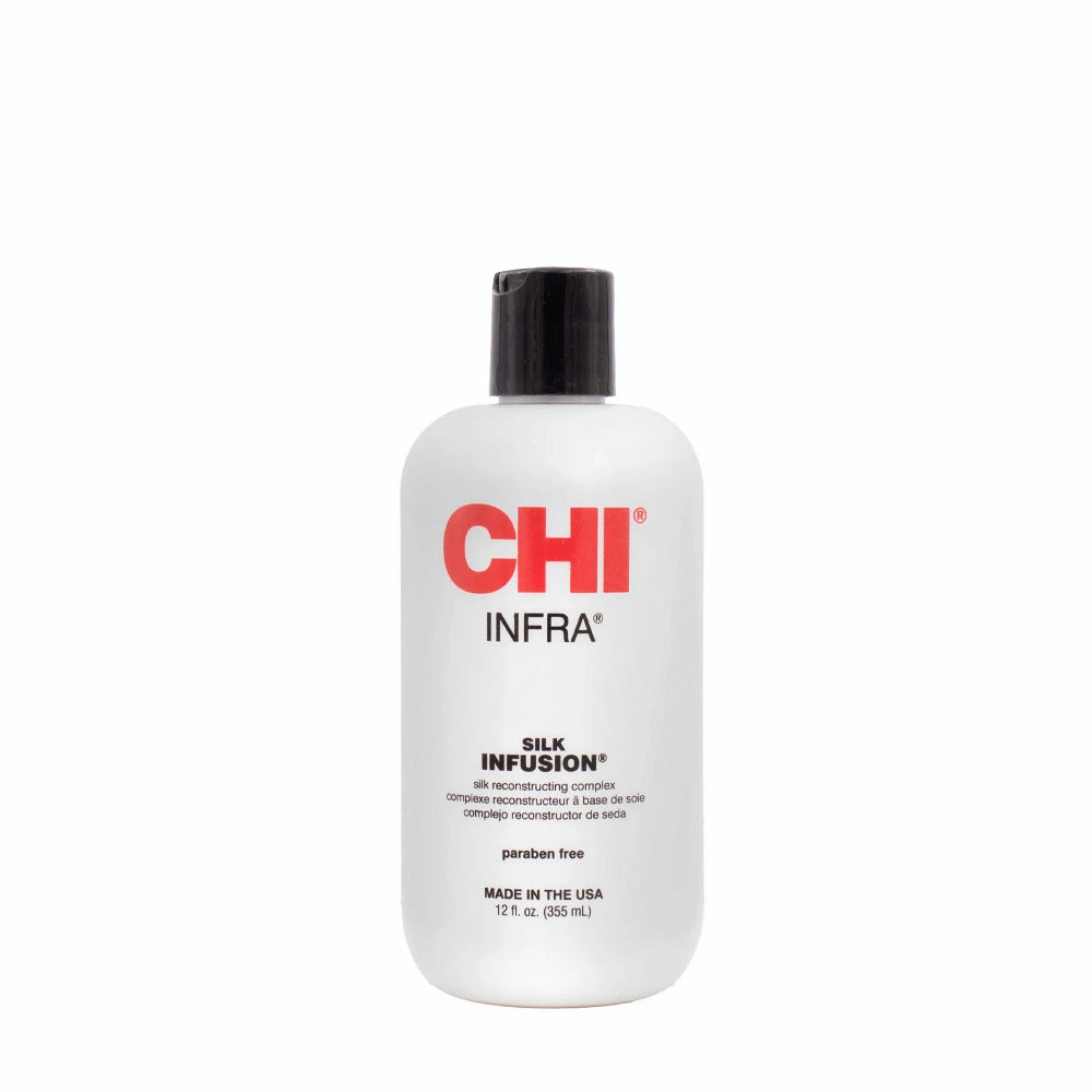 CHI Silk Infusion est un traitement reconstructeur à base de Protéines de Soie, de Blé et de Soie sans rinçage, qui vont pénétrer dans les cheveux et contribuent à les reconstruire, tout en apportant plus de souplesse, plus de discipline et éclat.