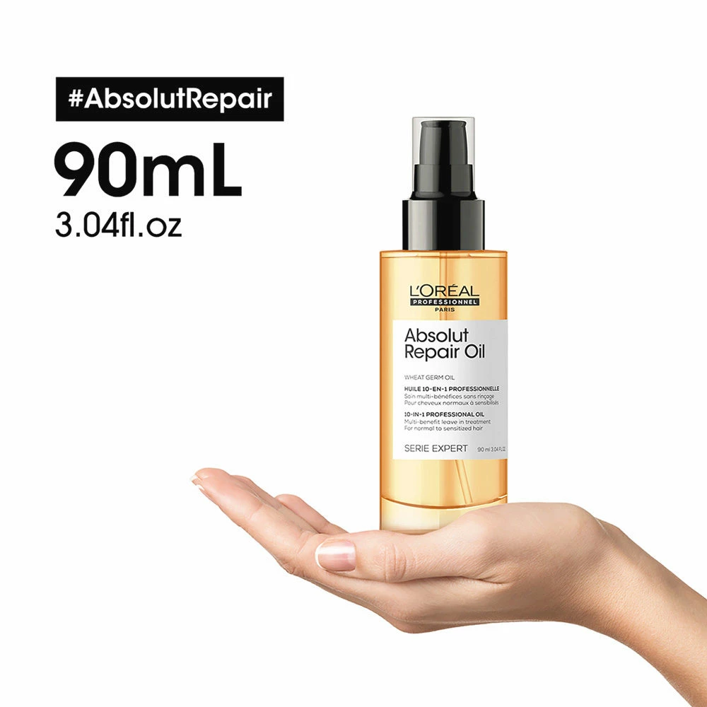 Utiliser l’Huile comme troisième geste de la routine Absolut Repair : à suivre après le Shampoing et l’Après-Shampooing/Masque.