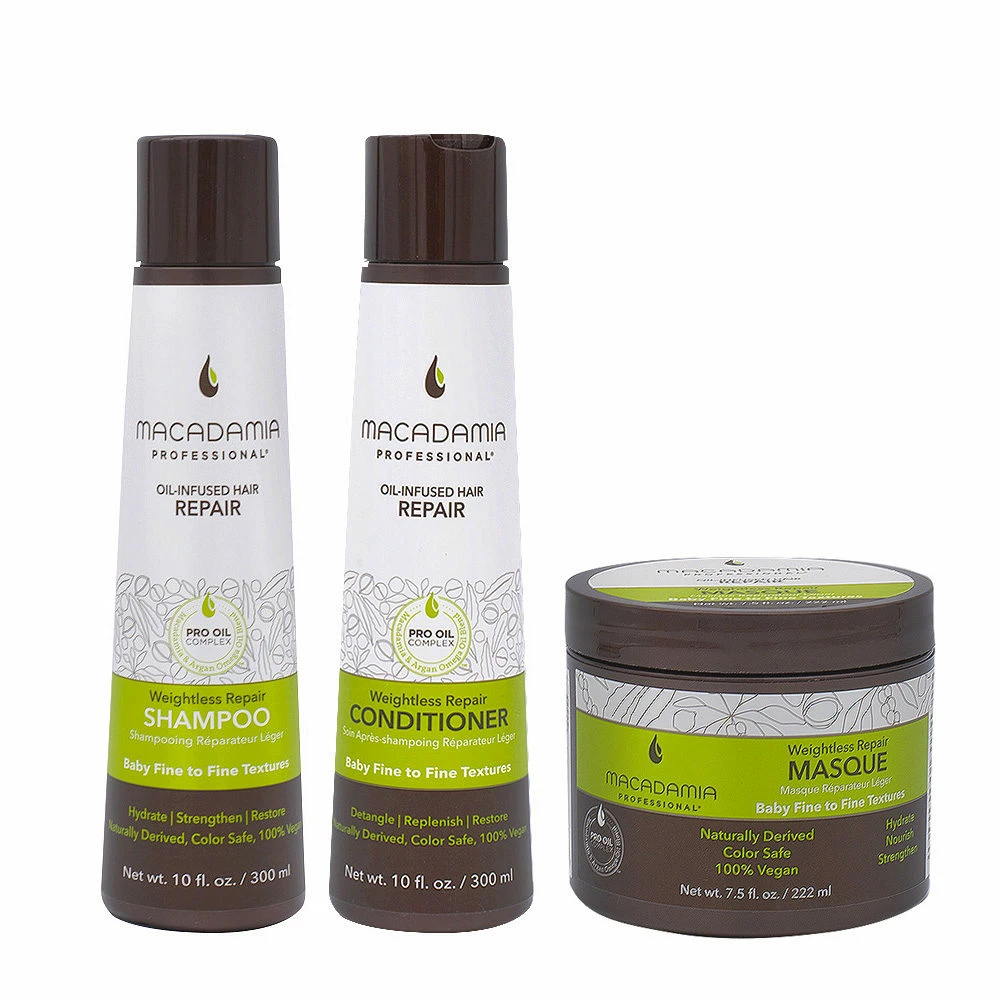 Macadamia Set Shampooing et Après-shampooing 300ml Cheveux abîmés et fins Masque 222ml